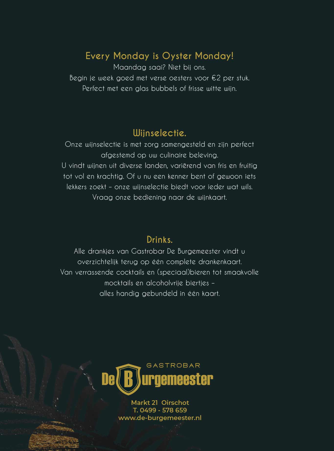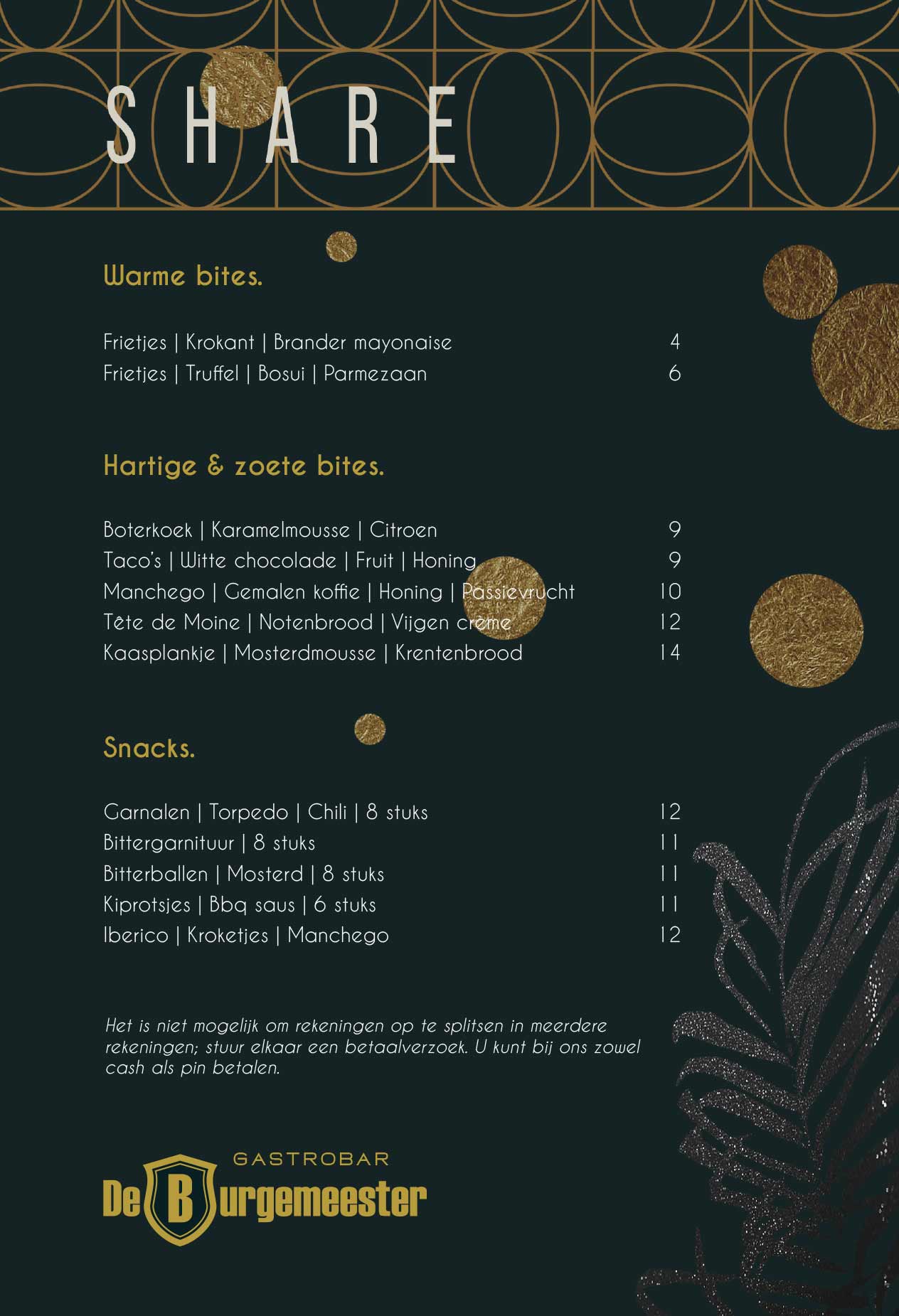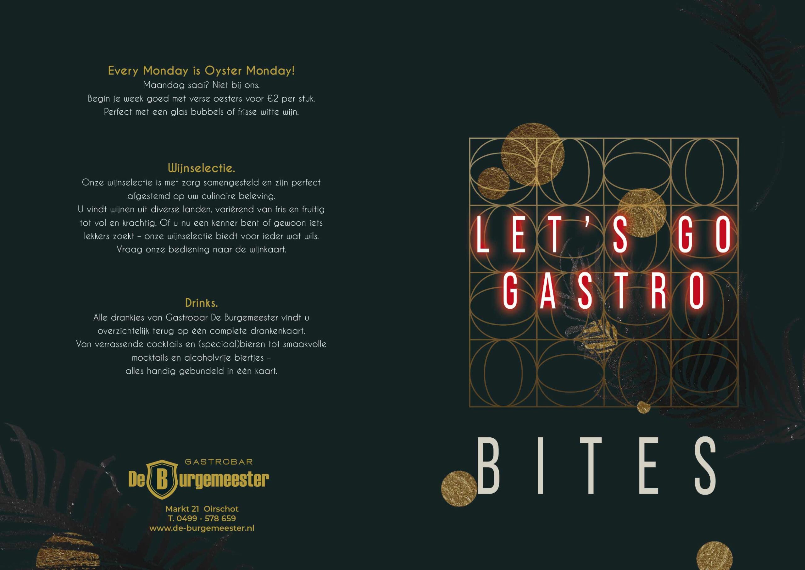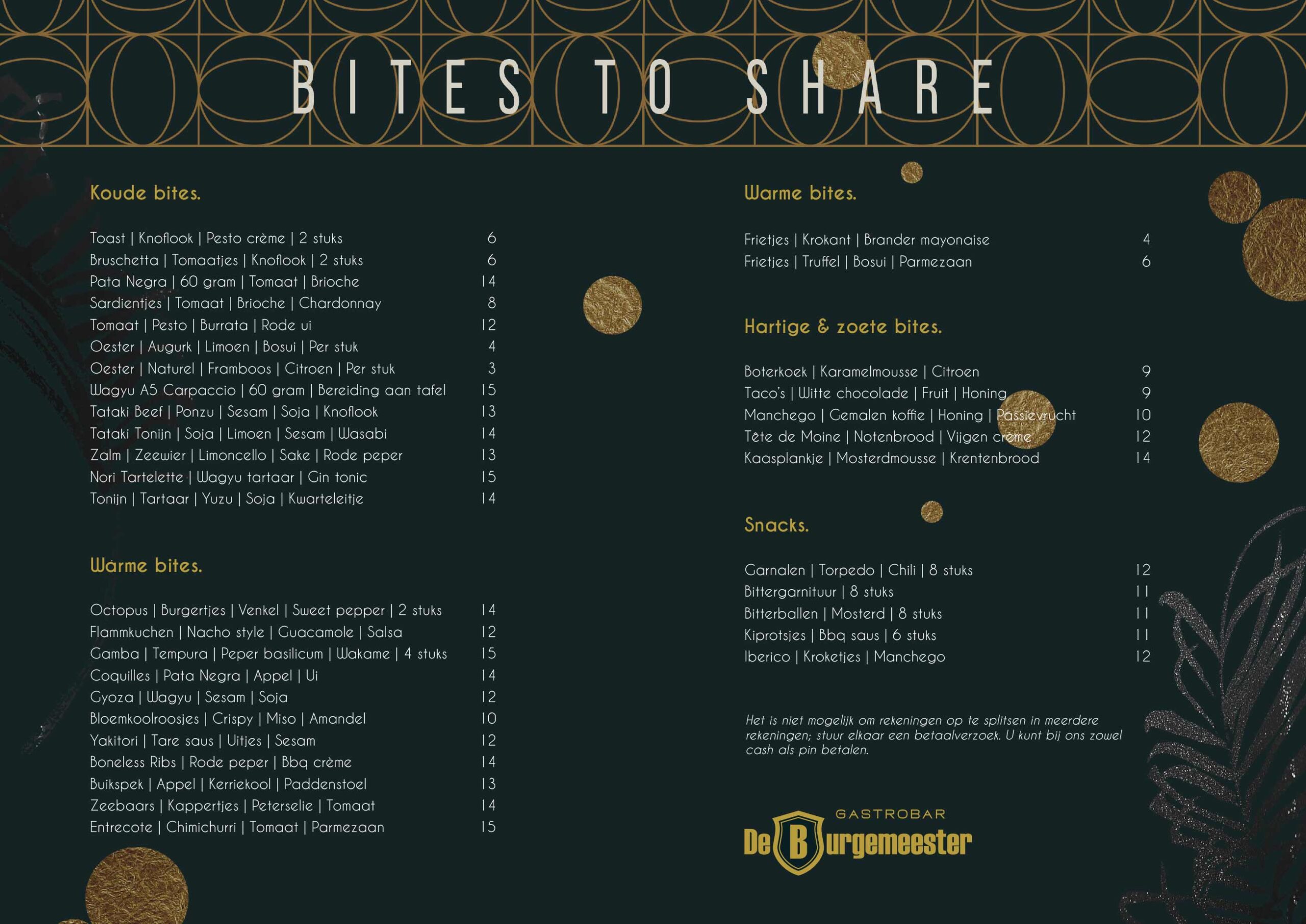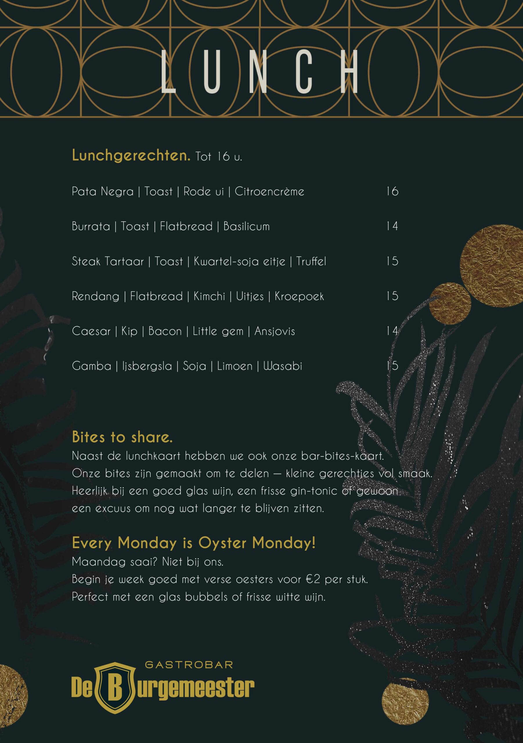 Bij Gastrobar De Burgemeester draait het om samen proeven en genieten. Naast de lunchkaart hebben we ook onze bar-bites-kaart. Onze bites zijn gemaakt om te delen — kleine gerechtjes vol smaak. Heerlijk bij een goed glas wijn, een frisse gin-tonic of gewoon een excuus om nog wat langer te blijven zitten.