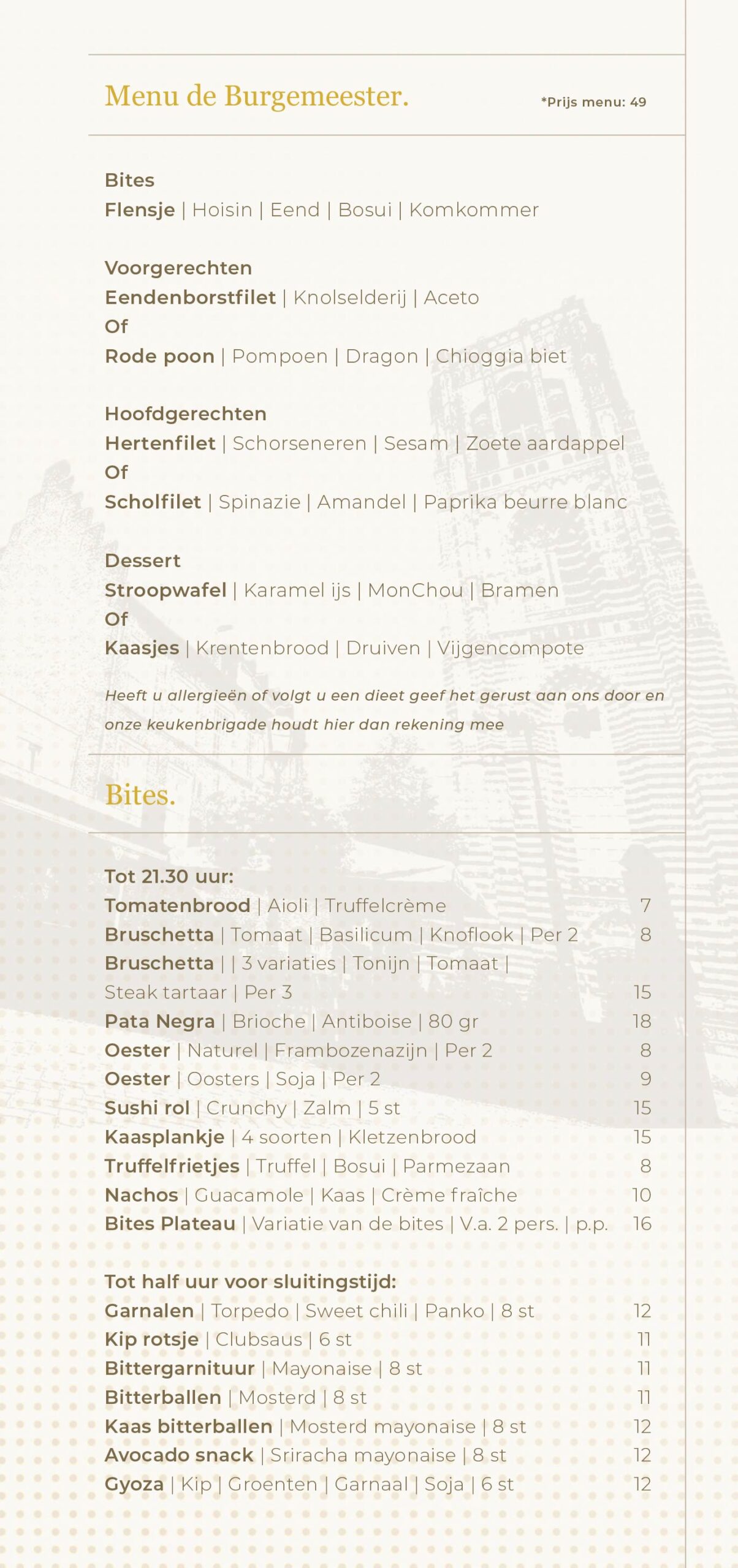 We werken uitsluitend met verse topkwaliteit producten. Hierdoor kan het zijn dat een gerecht soms niet beschikbaar is – uiteraard zorgen wij dan voor een smakelijk alternatief.