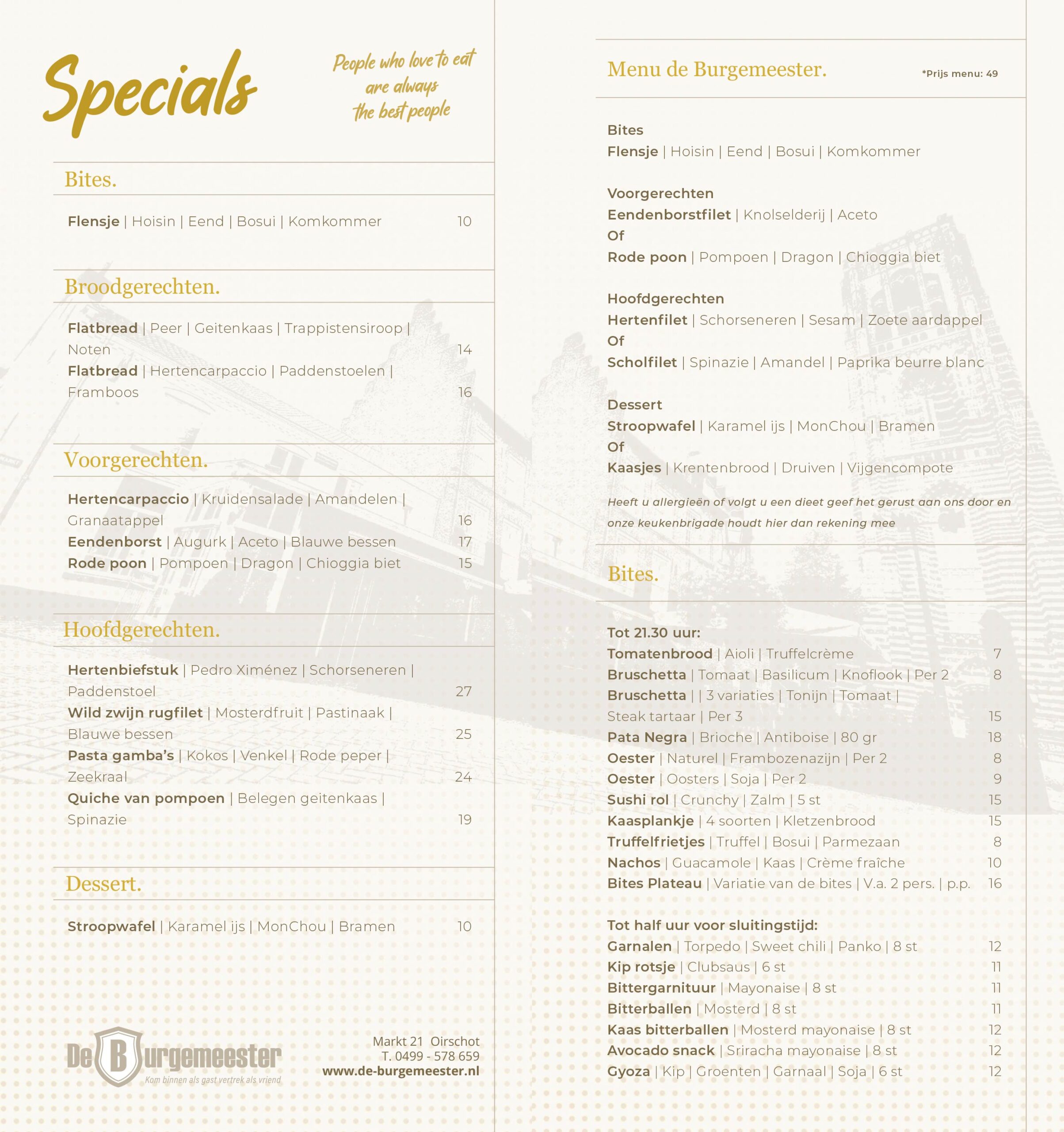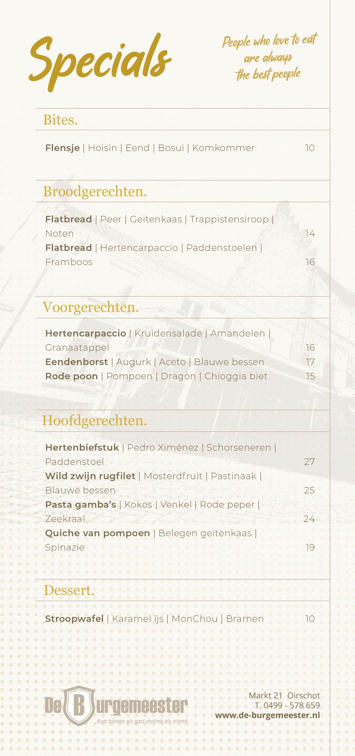 Ontdek onze specialiteitenkaart met gerechten die perfect passen bij de herfst en winter. Laat u verrassen door smaakvolle combinaties met wild, seizoensgroenten en andere pure ingrediënten.